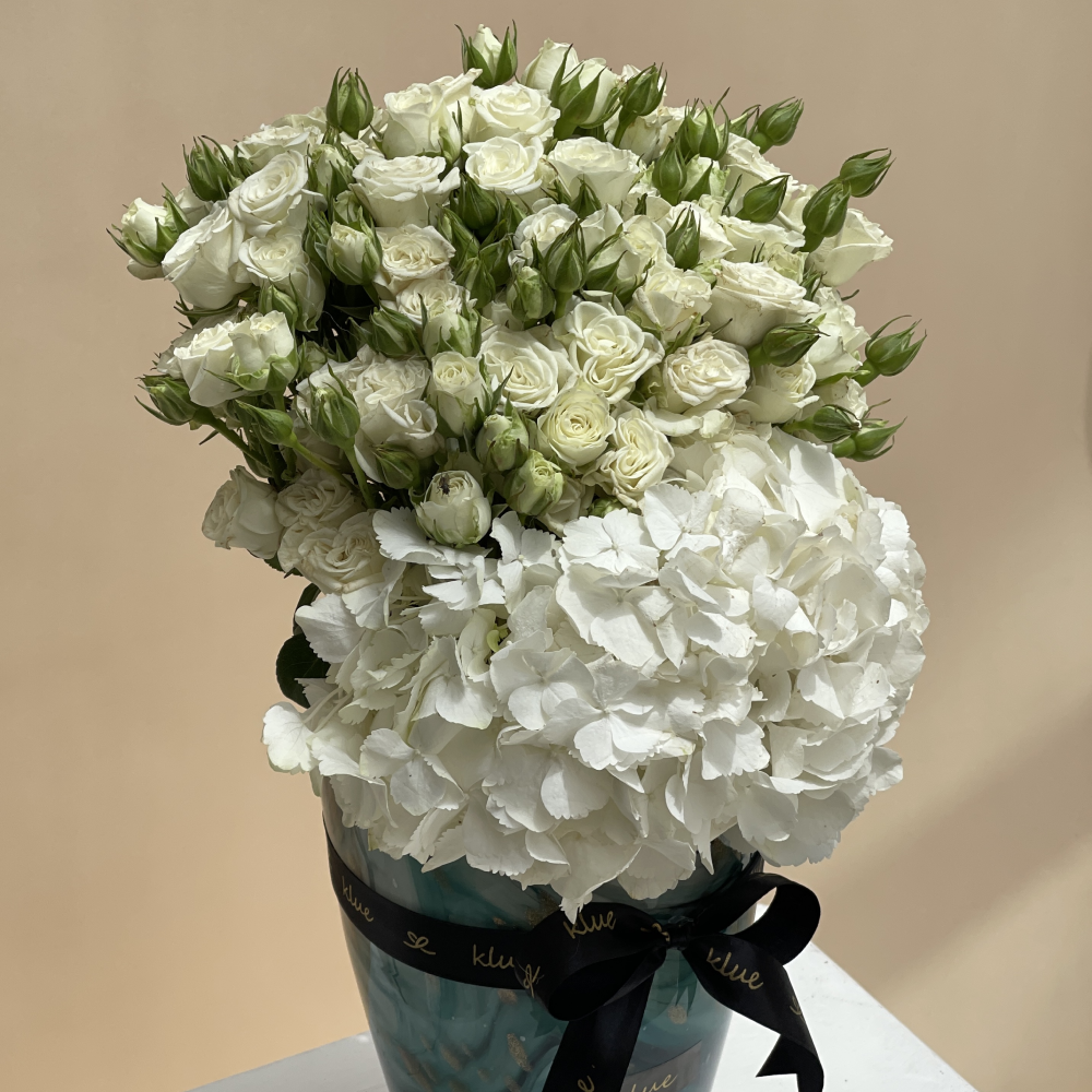 Gift this elegant vase, adorned with a beautiful arrangement of White Baby Roses and White Hydrangeas, and bring a touch of beauty and sophistication to any space.