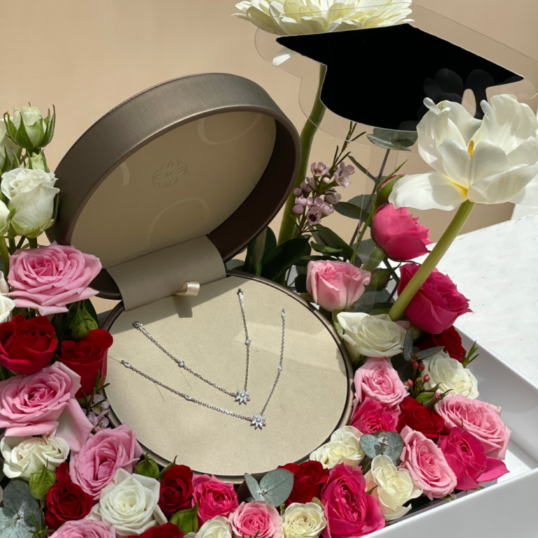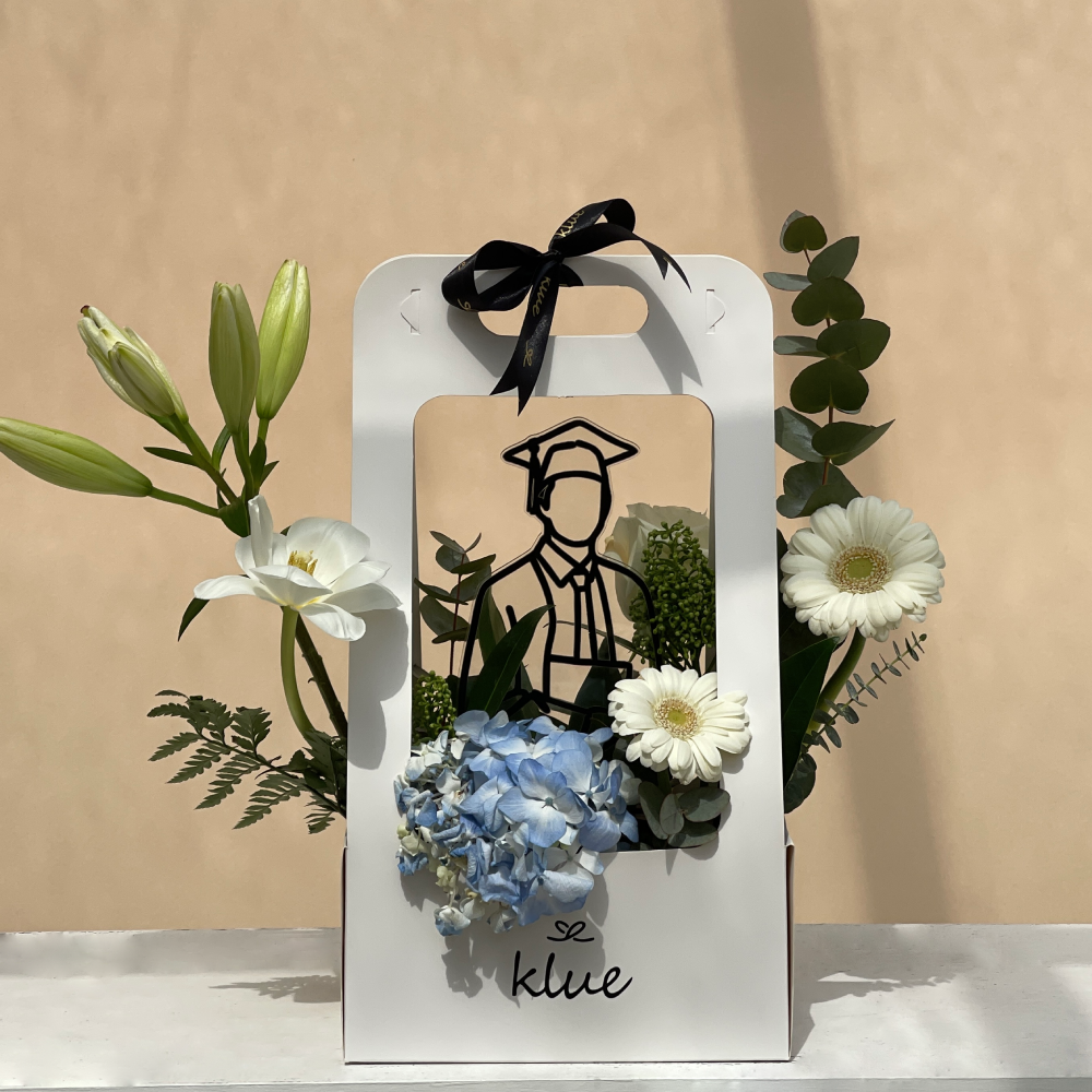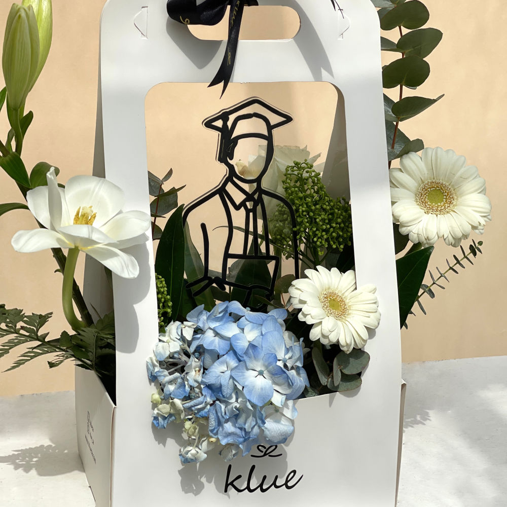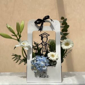 An elegant arrangement of natural flowers in soft tones surrounds the graduate symbol, representing a new beginning filled with hope and ambition. Every detail in this gift tells a story of dedication and celebrates reaching this important milestone.