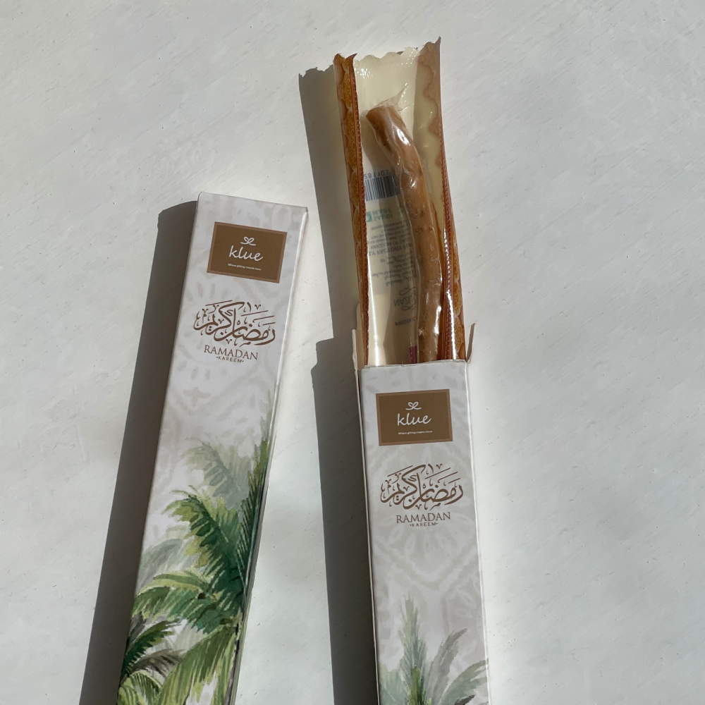 هدايا رمضانية جميلة تتضمن مسواكاً مكتوب عليه عبارة “رمضان كريم”، لمسة روحانية تعكس جوهر الشهر الفضيل.
