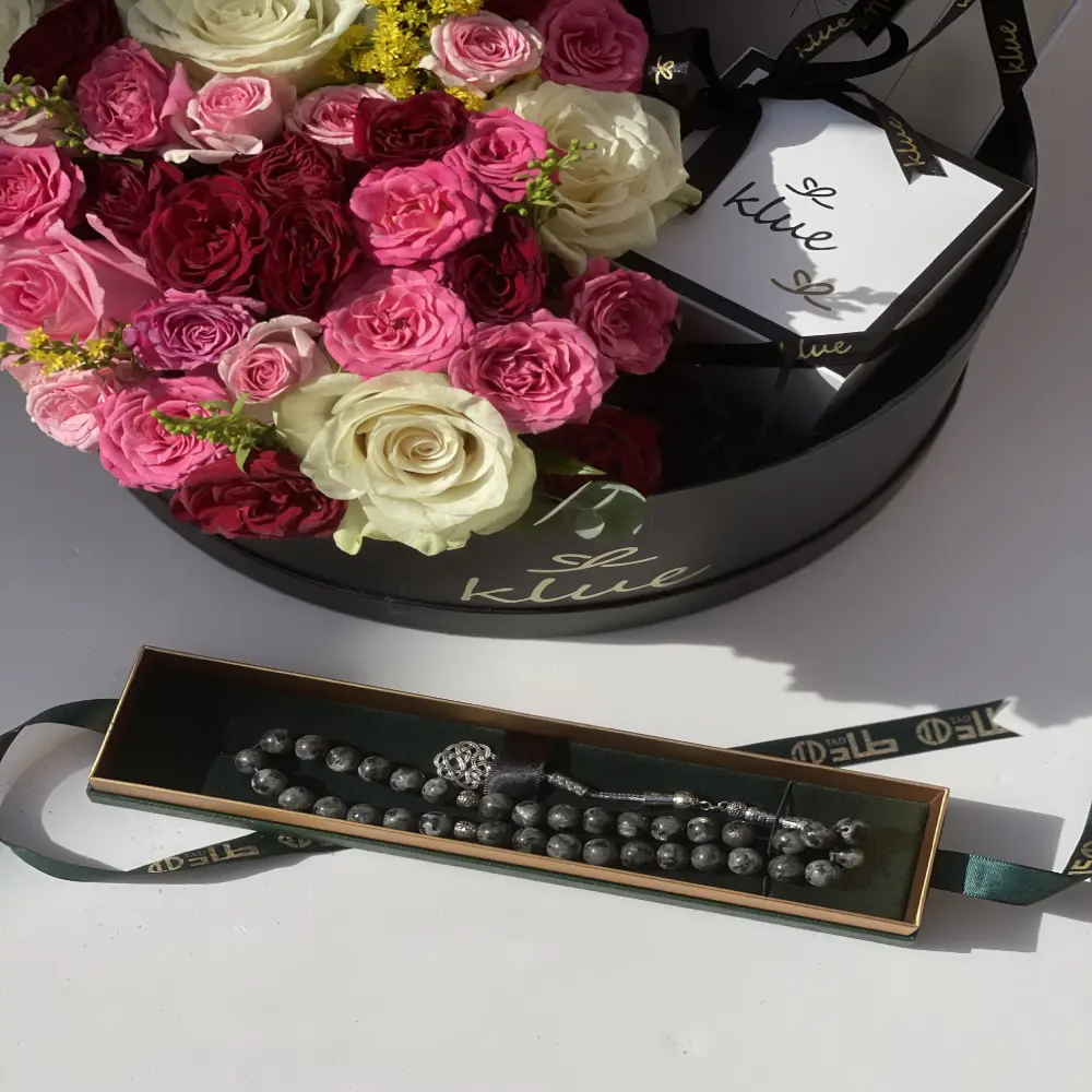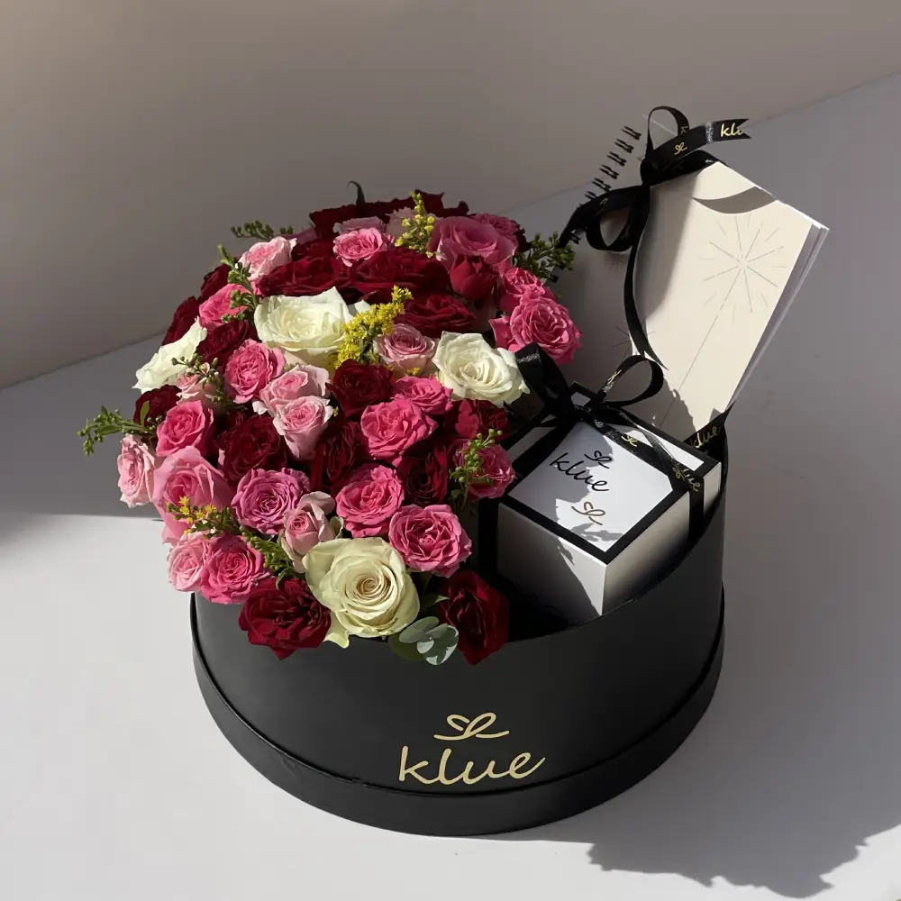 التقديم: منسق بعناية داخل صندوق هدايا دائري لتجربة فتح أنيقة ومليئة بالبهجة.