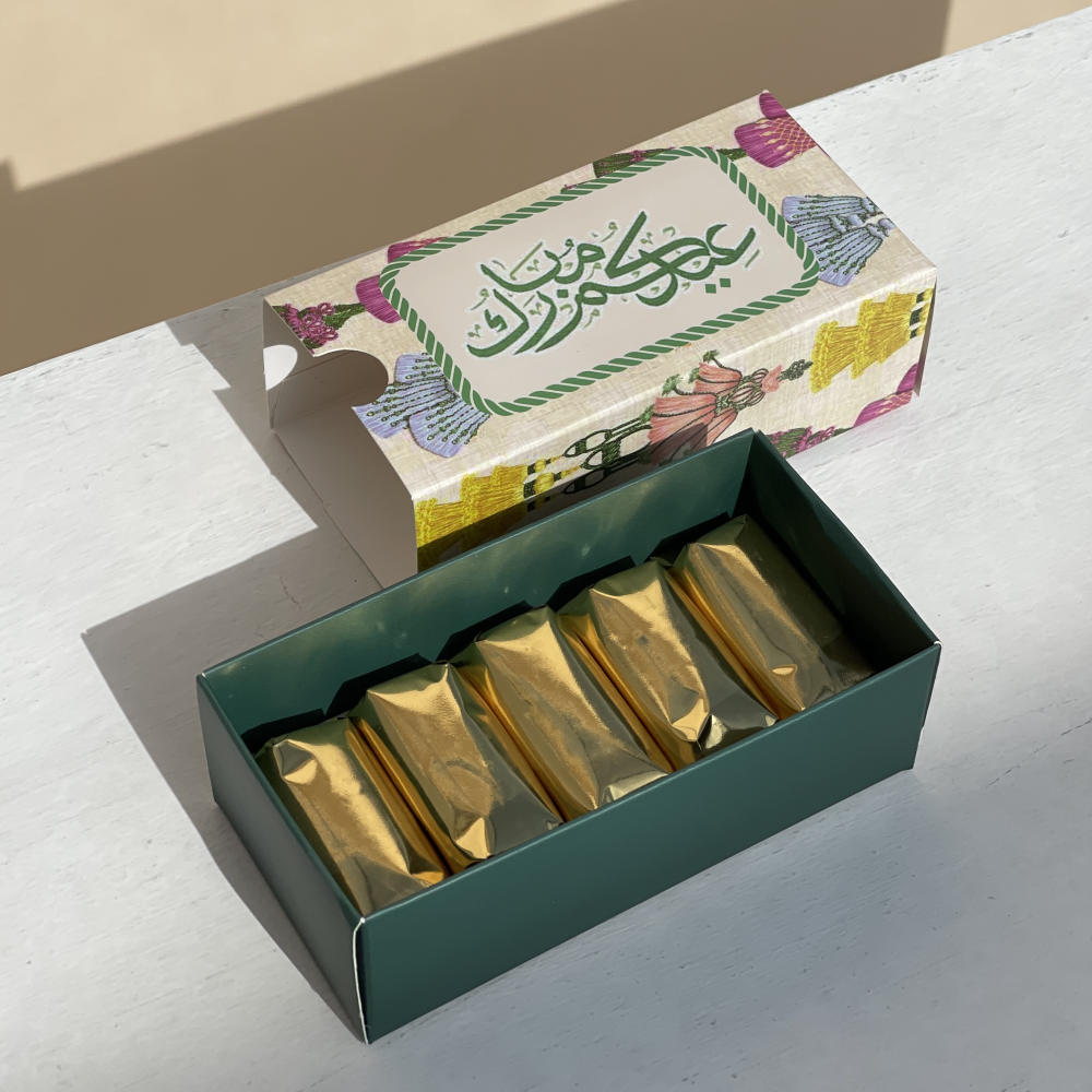 التغليف: علبة مطبوعة عليها عبارة “عيدكم مبارك”