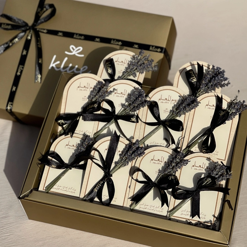 يضم هذا الصندوق الأنيق 11 قطعة من توزيعات يوم المعلم بلمسات مستوحاة من اللافندر، لتكون هدية مثالية تعبّر عن التقدير وتضفي لمسة من الجمال والتميز على المناسبة.